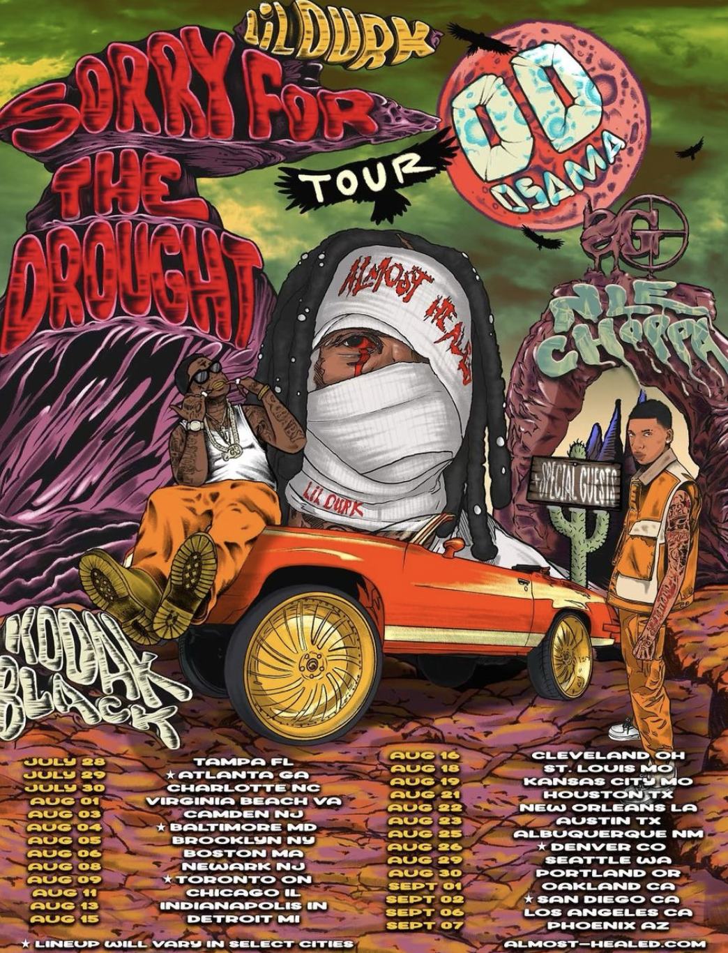 Starting in July, Lil Durk and friends will hit twenty-seven stops for the Sorry for the Drought tour. Last summer during Lollapalooza, Lil Durk had an accident on stage with some of the smoke machines, causing a major injury to his face. He had announced he would be taking some time to himself to recover physically and mentally. Since then, he has been laying pretty low, mostly trending for relationship woes. This would be the drought in reference, as Lil Durk shares “Been gone too long, but I ain’t leaving no more.”