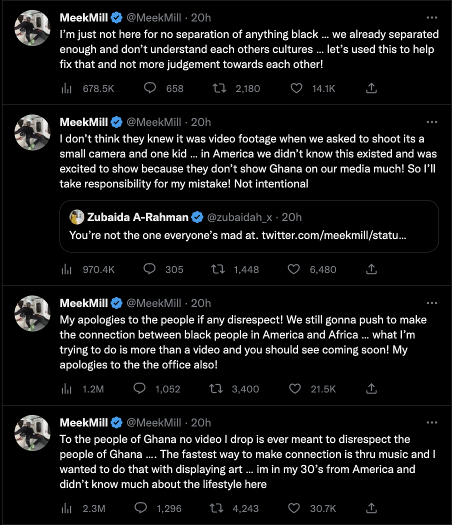 Meek Mill has since taken down the video, and shared his apologies. It was not his intention to disrespect the culture, or anyone there. He actually wanted to educate and spread awareness about the culture and country that he, all in all, loved visiting. There is no doubt in my mind this was apology was sincere, and hopefully Meek can continue to work with the community to learn about their culture and support in ways that everyone feels more comfortable with.